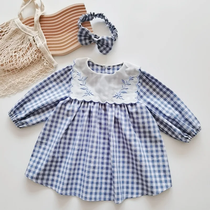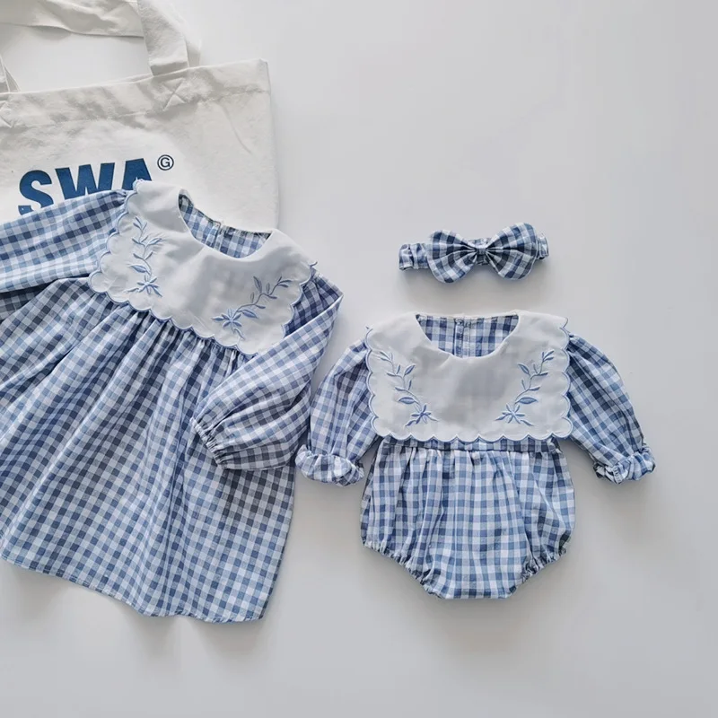 Spring Newborn Baby Girls Sister Embroidery Grid Dress Toddler Jumpsuit Baby Clothes Infant Girls Long Sleeve Children Dress